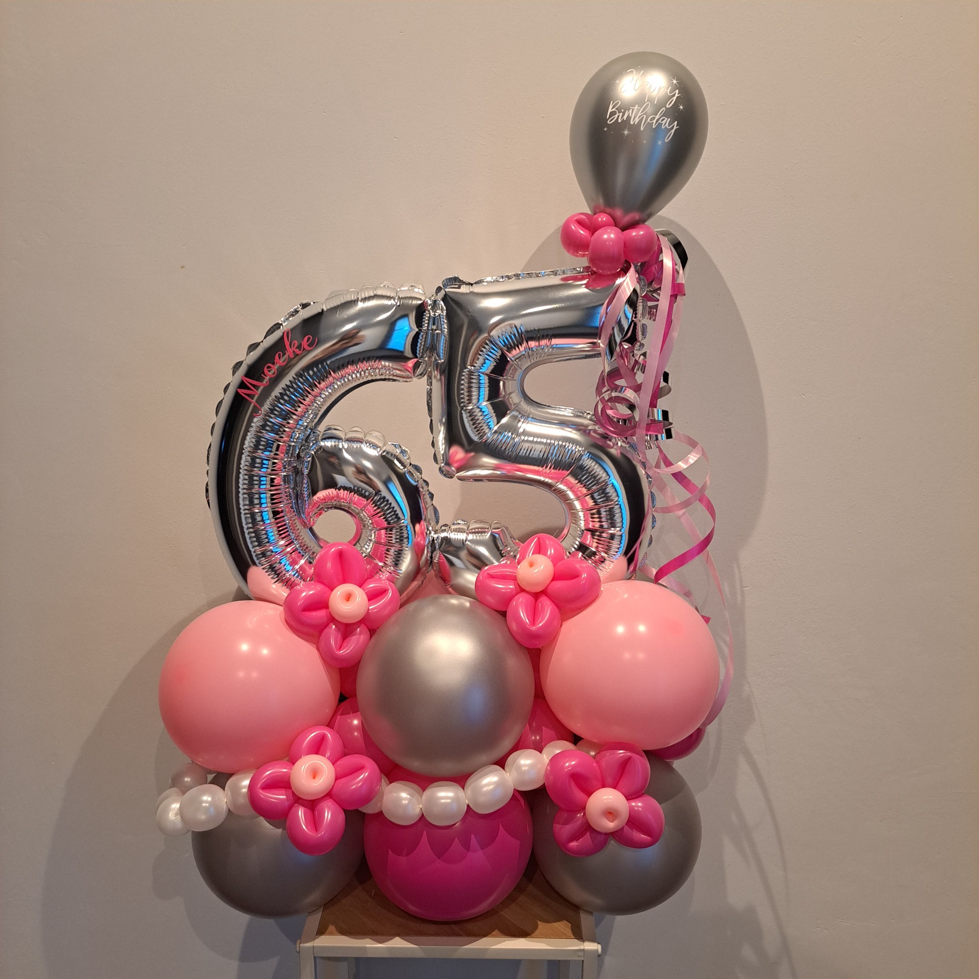 5. Cijferboeket met Luxe voet: Kan zowel voor 2 cijfers als voor 1. De 'Luxe' wil zeggen dat er wat meer afwerking is dan bij nr.3 ( met simpele ballonnen voet). Er worden bloemetjes of extra ballonnetjes in verwerkt. De heliumballonnetjes die eventueel mee afgebeeld staan, zijn in optie!